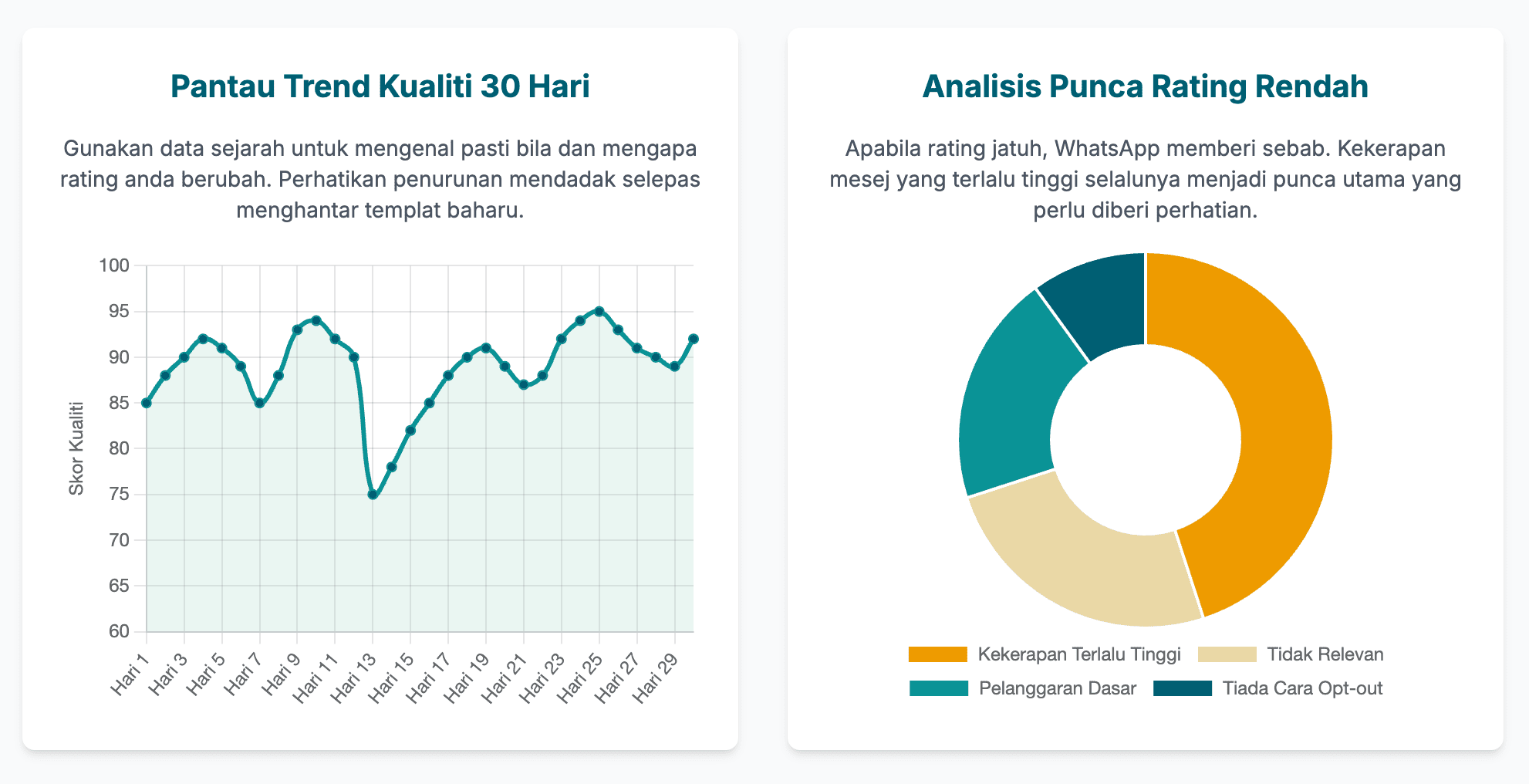 - Sentiasa Pantau Kualiti di Dashboard: Ambil tahu tentang sejarah kualiti (quality history) akaun anda untuk tempoh 30 hari. WhatsApp menyediakan data tentang sebab rating anda jatuh (jika ada) dan kualiti templat (template quality) mesej anda jika low atau medium quality. Gunakan data ini untuk kenal pasti masalah dengan cepat.